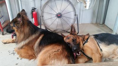 Floki is my male, long coat GSD. Jovie is my female GSD. Floki goes to work with me everyday. (I work at a ranch) I decided to see if Jovie would enjoy it as much as Floki. After about 30 min, this is where I found them. Jovie was worn out!